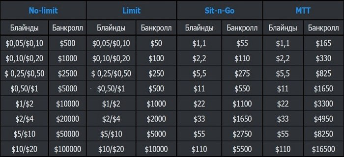 Есть наставления, по которым существует реальный шанс высчитать наиболее рациональные показатели для чемпионатов и кэш-столов, где каждый геймер будет более-менее комфортно ощущать себя, при наличии определенного размера банкролла. Начинающие игроки в покер могут придерживаться следующей таблицы банкролл-менеджеметнта: