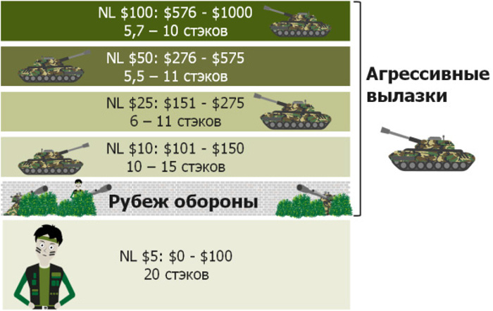 Цель агрессивного банкролл-менеджмента в покере состоит в том, что геймер начинает вести игровой процесс на лимитах, для которых он располагает запасом до 20 стеков. При достижении этого количества он незамедлительно переключается на другой диапазон ставок, более высокий.