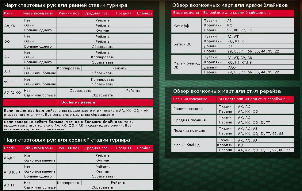 В многостоловых онлайн чемпионатах МТТ и 9maxбеспрекословно придерживаться чарта тоже не следует, тем более на ранних позициях. Его можно использовать только в качестве основы.