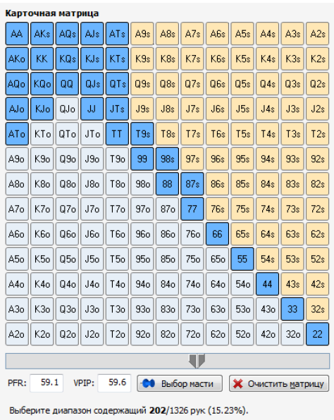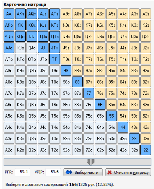 Помимо этого подобные таблицы используются и при игре в покер в МТТ-формате. Тут диапазон разыгрываемых стартовых карт тоже зависит от занимаемой позиции. Таким образом, пребывая на ранней позиции, необходимо применять данный чарт стартовых рук в покере 9 max для МТТ: