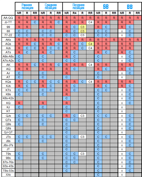 Когда уже один участник карточной раздачи уже вошел в торги и наступает ваш черед делать ход, то прибегайте к следующими таблицами чарта стартовых рук в покере: