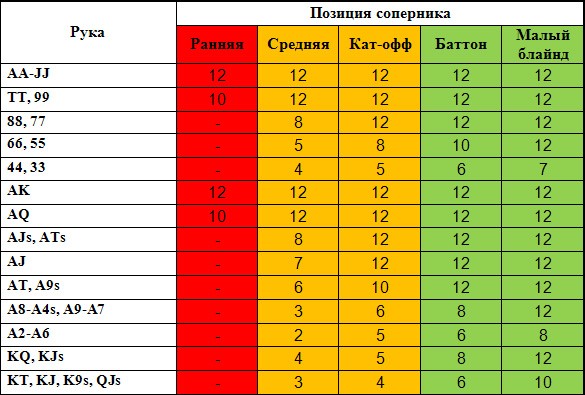 Когда вы находитесь на ранней позиции и должны принять решение первым, то следуйте рекомендациям представленной ниже таблицы. Это позволит вам положительно воплотить тактический прием пуш-фолд: