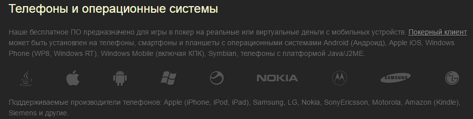 Это серьезный покерный рум, специализированный именно для игры в Техасский холдем и Омаху как на игровые фишки, так и на реальные деньги. Причем играть вы можете не только на смартфонах и планшетах, но и на обычных мобильных телефонах с поддержкой Java. Теперь все владельцы мобильных устройств имеют три варианта, как и где скачать покерный клиент на личный ПК или портативный девайс: