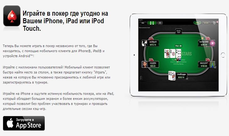 Если вы еще не имеете учетной записи – можно зарегистрироваться в Покер Старс непосредственно с помощью телефона/планшета через мобильное приложение. Скачиваемый клиент Покер Старс для iOS способен порадовать игроков качественным игровым интерфейсом, который отлично работает на всех «яблочных» девайсах.