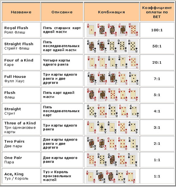Иерархия комбинаций и множитель выплаты для покериста можно определить по таблице: