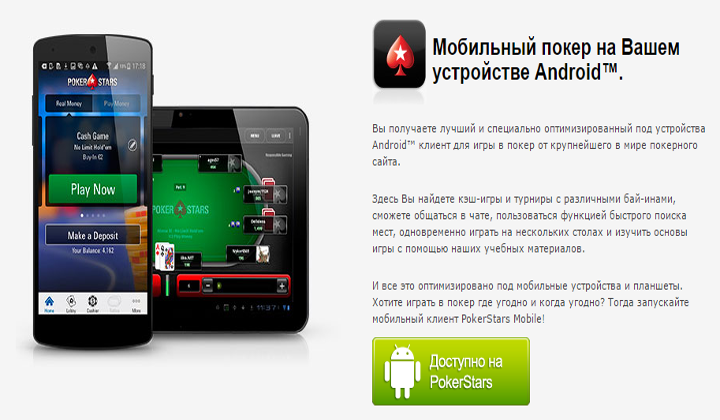 Сегодня покерный клиент Покер Старс на Андроид использует, наверное, каждый второй покерист. Это можно объяснить тем, что геймеры, решившие бесплатно скачать Poker Stars на Android повсеместно играют в покер на реальные деньги посредством мобильных телефонов либо планшетов. В том числе и те игроки, которые уже имеют игровое приложение для ПК/ноутбука.
