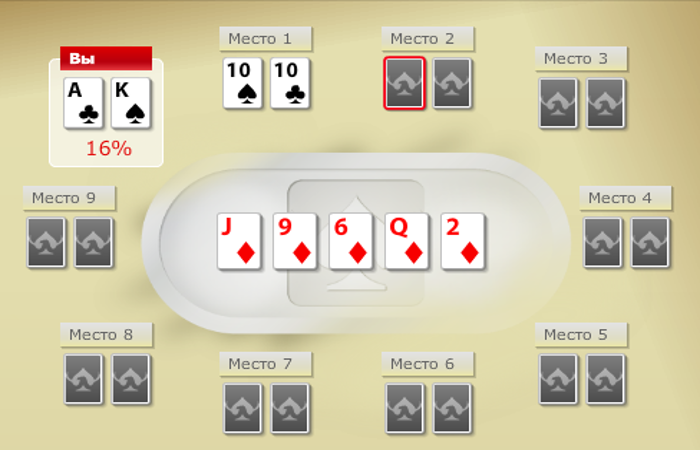 Если среди карманных карт нужная масть отсутствует – игровой банк делится в равных частях. Например, у вас на руках трефовый Туз и Пиковая Десятка, у соперника такие точно масти, но только две Десятки, а на борде лежат пять бубновых карт разного достоинства.