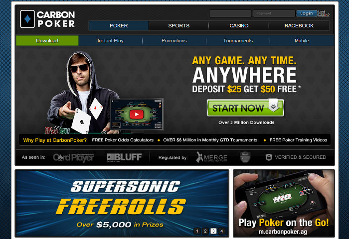 Продолжая рассматривать лучшие американские покер-румы, позволяющие играть европейским покеристам против регуляров из Соединенных Штатов Америки, стоит упомянуть о Carbon Poker, который находится в составе популярной сети Merge. Данная онлайн комната для игры в покер на реальные деньги работает на рынке гемблинга более 10 лет.