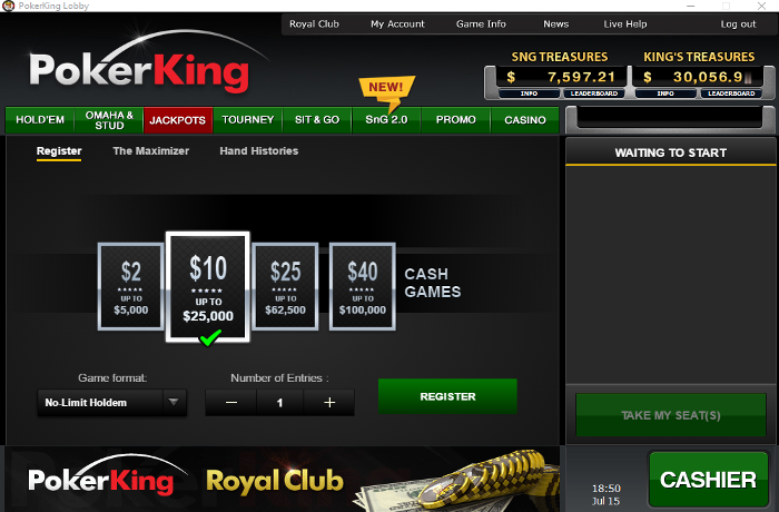 PokerKing – это популярный американский покер-рум, входящий в сеть Winning. Больше того, данная комната является единственной в мире гемблинг площадкой, функционирующей на русском языке, но вместе с тем позволяет вести игровой процесс против американских регуляров. Она предоставляет бонус на первый депозит, величина которого непосредственно зависит от суммы пополнения.