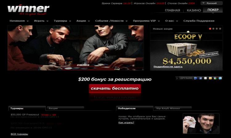 - Официальная страница покер рума ВиннерПокер доступна на русском языке и разнится от остальных комнат интуитивно понятным, а также предельно простым интерфейсом пользователя. Русскоязычный саппорт работает круглосуточно.