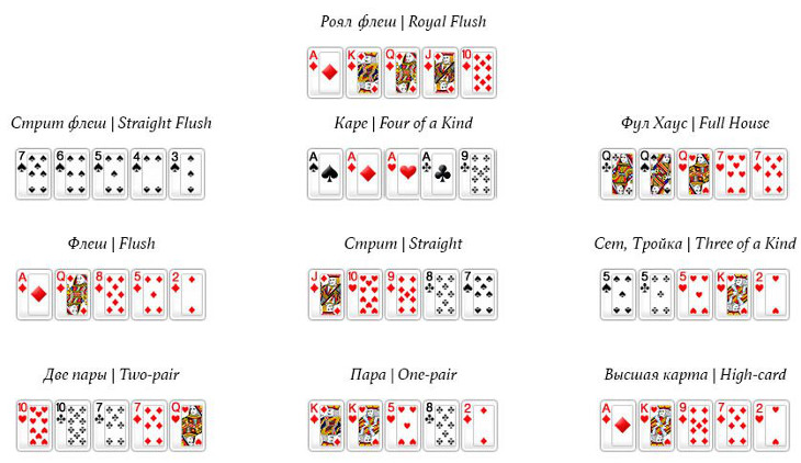 Ниже мы постараемся рассмотреть все покерные комбинации более детально на конкретных примерах и в картинках. Их общее количество 11 штук, но одна из них является дополнительной комбинацией (если игра осуществляется с Джокером), а 10 основными. Итак, начнем с самой сильной руки и постепенно перейдем до самой слабой комбинации в покере.