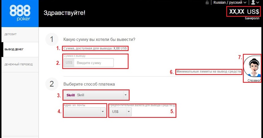 Первый вывод денег из комнаты 888 Покер следует производить исключительно на тот счет/карточку, с которого вы пополняли баланс и желательно в эквиваленте не большем, нежели был стартовый капитал.
