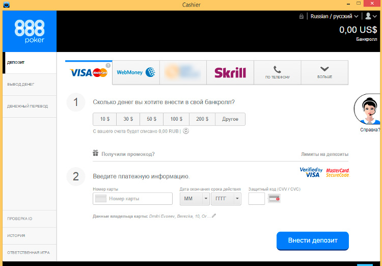 Это могут быть сканы/фотографии паспорта (как правило, 1-я и 2-я страницы), водительское удостоверение международного образца и квитанции об оплате услуг ЖКХ (давность, которых не превышает 90 дней). Мы рекомендуем не откладывать идентификацию личности игрока в долгий ящик и после регистрации в 888Poker самостоятельно выслать пакет документов на проверку. Также осуществить кэшаут имеют возможность лишь те геймеры, которые уже пополняли игровой счет (хотя бы на минимальную сумму 400RUB). Иными словами, если играя в рамках акций рума, по бездепозитному бонусу или на фрироллах вы выиграли некоторую сумму, для вывода выигрышей все равно придется вносить средства.
