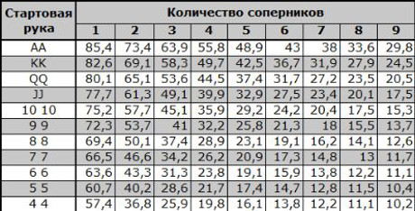 С таким карманными картами всегда нужно входить на флоп, но это не значит, что допускается вести игру лишь с вышеперечисленными руками. В покерных дисциплинах, берите во внимание, что на вероятность выигрыша влияет не только достоинство имеющихся карт, но и количество противников.
