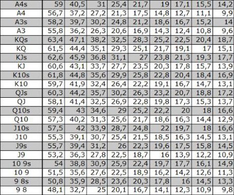 Ниже мы разместили префлоп-таблицу на которой наглядно продемонстрировано каким образом меняются шансы игрока на победу в рамках раздачи, опираясь на силу карт, а также число участников. Эти показатели представлены в процентном соотношении и указаны для ситуации, когда каждый оппонент на префлопе совершили ва-банк (олл-ин).