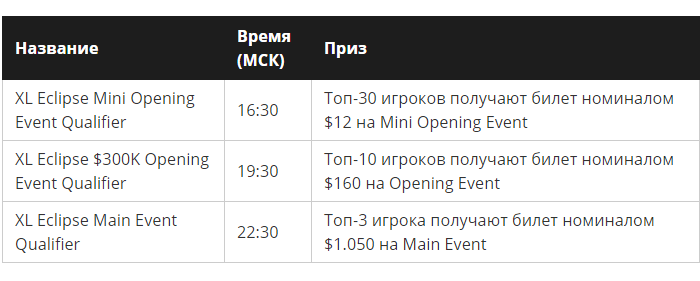Помимо этого, два раза в сутки все зарегистрированные и внесшие деньги на депозит пользователи могут принимать участие в покерных мероприятиях $1.000 XL Celebration, которые стартуют в 12:30 и 02:30 по МСК. Также бесплатные входные билеты на каждодневные отборочные состязания XL Eclipse уже доступны и ожидают всех желающих.