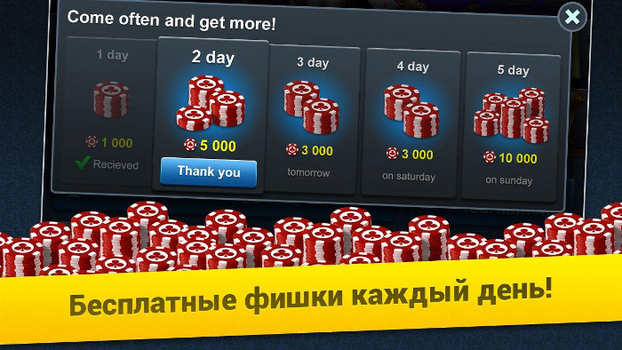 Если скачать Покер Арена на Андроид бесплатно и начать играть, то покерные фишки и золотые монеты не имеют никакой денежной ценности, так как каждый зарегистрированный покерист получаете их безвозмездно на свой игровой счет. Больше того, они ежедневно пополняются в размере 1000 штук.