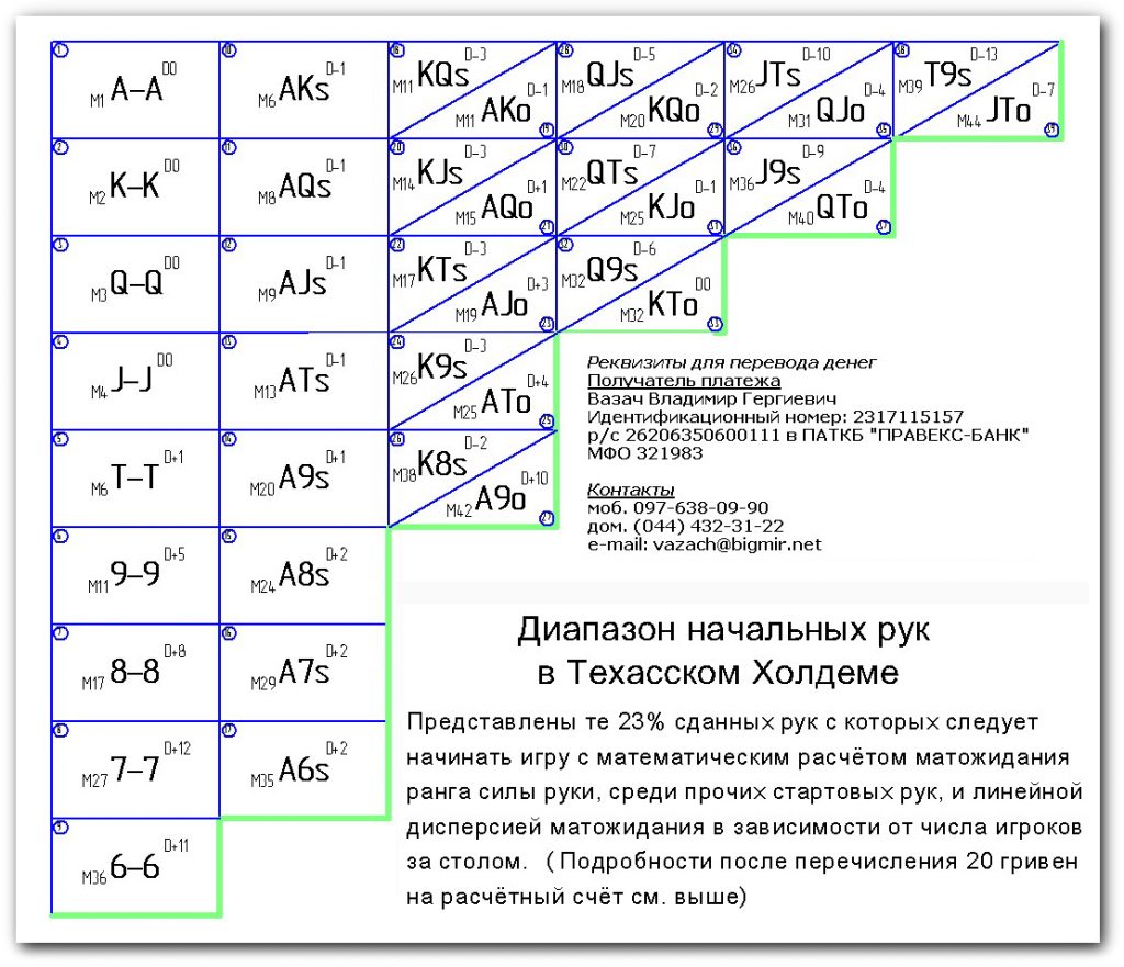 Но для правильного понимания данных показателей, необходимо освоить базовые обозначения, которых не всего лишь несколько. Делать это весьма легко. Например, знак «+» в конце демонстрирует, что этот спектр в покере по верхнему пределу не имеет ограничения – он заканчивается самой большой выигрышной комбинацией.