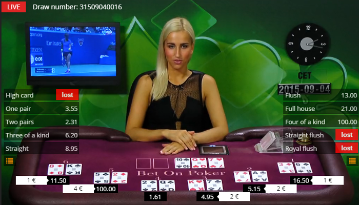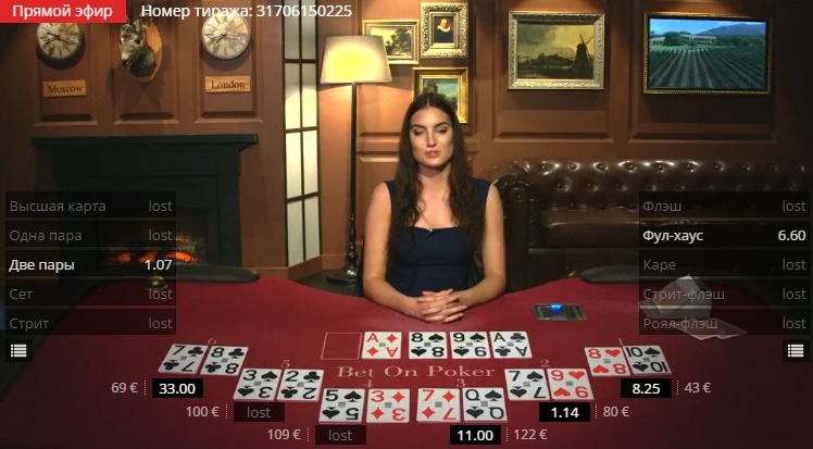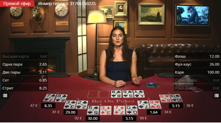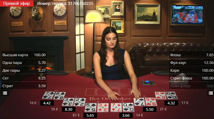 Рассмотрим пример того, как происходят ставки на покер в букмекерской конторе, и как на него принимаются ставки. Вы приходите к букмекеру и видите, как на экране перед Вами красивая девушка-дилер раздаёт карты. Если верить БК, то все раздачи проходят в прямом эфире, однако правда это или нет — это остаётся на совести самого букмекера.