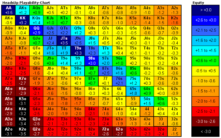 Как видно из всего вышесказанного в покере есть несколько видов таблиц стартовых рук. На одних описаны только вероятности на выигрыш, в других более полные – они еще учитывают занимаемую позицию за игровым столом, а также решение соперников. Поэтому вам лишь остается отыскать в них свою ситуацию и придерживаться данной рекомендации.