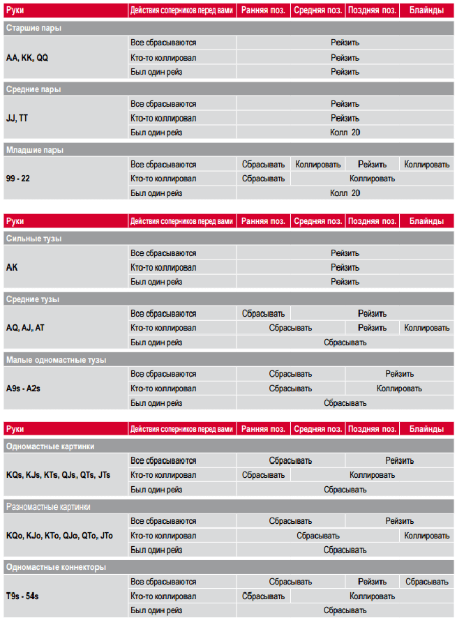 Аналогичные сведения порой могут иметь вид матрицы начальных рук. Правда, количество информации на таких руководствах несколько ограничено. Это или подсказка в каких моментах стоит совершить повышение, либо в каких случаях скинуть карты в пас. Поэтому поначалу оптимальным вариантом остаются полные источники с максимальным количеством данных.
