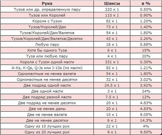 Здесь указаны шансы игрока на стадии префлопа получить конкретное начальное сочетание карт. Больше того, в ней представлены как вероятность в соотношении, так и шансы выстраивания необходимой для геймера руки в процентах.