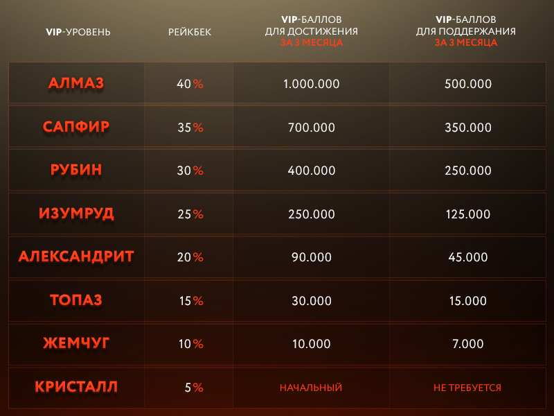 Иными словами, при достижении, например, уровня «Изумруд» в первом квартале (дата его достижения не имеет значения), игрок может рассчитывать на размер рейкбека в соответствии с данным статусом до завершения текущего статуса. Для поддержания VIP-статуса необходимо меньше количество баллов, нежели для его присвоения.