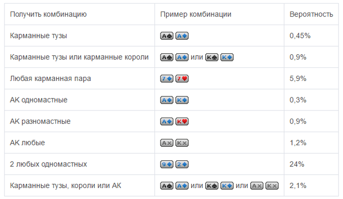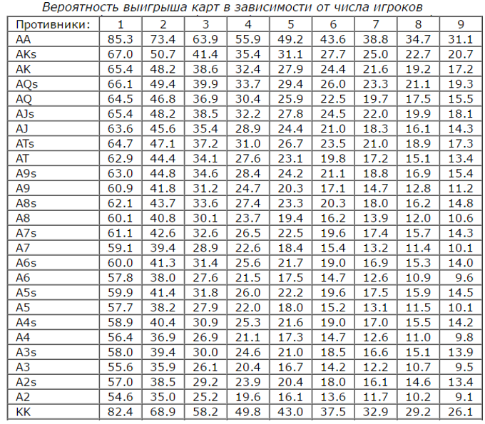 К примеру, шанс выпадения определенных карт на стадии префлопа или победить с конкретными стартовыми руками в противостоянии двум и больше соперникам. По этой причине для начинающих игроков следующие таблицы нужно всегда держать под рукой, так как из них они смогут узнать следующую ценную информацию: