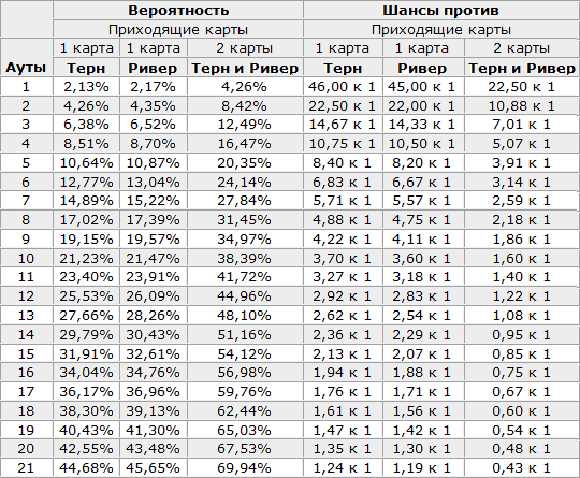 Рассмотрим это на наглядном примере. Игрок на этапе флопа получил недостроенный Флеш, и для полноценного сочетания ему не хватает одной карты. Значит, у него 9 аутов, поэтому шансы на флопе получить Флеш составляют 18% (9*2), а на терне и ривере – 36% (9*4). Быстро определить вероятности в покере вы можете из уже готовой таблицы: